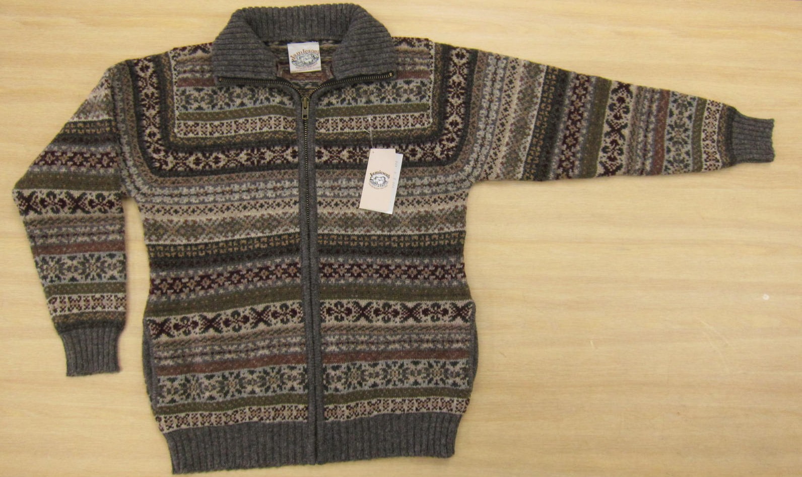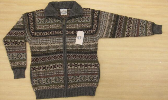 英国シェトランド島のジェイミーソンズJameisons、2025年の新作です。新提案はジップジャケットです。価格54,780円(税込)です。ベースカラーはスレート(屋根瓦のグレー)の1色のみです。届くまでちゃんとできているか、心配でしたが、頼んだ通りに仕上がっていて、安心してます。アウター風にしたかったので、ポケットはサイドに付けました。サイズ44を着てみました。私にはでかいです。フードは付けずに衿だけです。ジッパーの上下で衿の大きさや形に変化が楽しめるようにしています。 自分で言うのもなんですが、大成功、です。予想していたよりもずっといい。待ってた甲斐がありました。ここでサイズの説明を。ジップジャケットの展開は40"から44”までの3サイズ。今まで首後ろのブランドネームにはおかしなサイズ表示が付いていて混乱を招いていたので、今年からそれを外してもらいました。多分日本では当店だけの特別措置だと思います。サイズはブランドラベルの裏のウールマークの下に書いてあります。40″(日本のメンズMに相当) 胸囲102cm・着丈65cm42”(日本のメンズLに相当) 胸囲106cm・着丈68cm44”(日本のメンズLLに相当) 胸囲112cm・着丈71cmただ、いつも言うように、ココのユニークな特徴として、二回りほど大きく編んでおいて、洗って縮ませて手編みのような立体的な風合いを醸し出す、ということから、仕上がりサイズは他社のセーターに比べてかなり不安定です。あくまでも標準的な目安だとお考えください。やむなくモデルになっています、私・野沢のプロフィールは、年齢67歳、身長164cm、体重72kg,胸囲98cm、ウエスト87cm、首が長くなで肩で胴長、腕は短くシャツの裄丈で78cmです。なお、ジェイミーソンズJamiesonsについてのブランド紹介はこちらをご一読ください。さて、よもやま話。例年通り昨年12月初めに来日した社長のピーター・ジェイミーソン、まずは嘆きから始まりました。乗り継ぎ時間が短すぎて、人間しか間に合わず、できたばかりの最新のサンプルを乗せた荷物が2日遅れてようやく今朝届いたばかり。「昨日の客とは商談もできず、Jack(私のこと)が新作を初めて見せる客になったよ」(私は嬉しかったけどね)一昨年この精緻な新柄と斬新なカラーリングを考えた企画担当者は、この島で生まれ育った30代の若い女性スタッフ。英国の専門学校を出て就活中にコロナになったため生まれ故郷のこの島に戻ってきたそう。デザイナーでもありプログラミングもできて、とても貢献している様子。会ってみたいな。あとは、かみさんが大腿骨をまた負傷して、今度は本土で大手術なんだよ、なんて、ほんとによもやま話に花が咲く。ところでピーター、このセーターの柄、一体何色ぐらい使ってるの、ものすごく複雑だけど。彼は即答でした。これは予約会の時のクイズにもしました。正解は13色。いいかい、Jack、うちのジャカード編みのマシンは14色セットできるんだ。で、安全のために最端の一色分を空ける、だから13色。私驚いて曰く、たった13色で何十色もあるかのような多彩なパターンを組み上げられるのか、すごいね。Peterウィンクして曰く、それもパタンナーの腕の見せ所なんだよ。