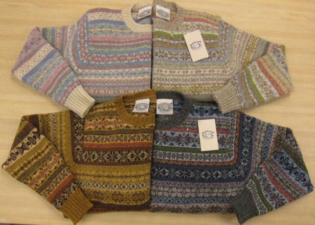 ☆さて、今年の新色。ゴッホ・イエローです。モネ・ホワイトやターナー・イスリット、というなら、なんでゴッホ・イエローがないのよ、という有力者のご意見があり、そりゃもっとも、と、ゴッホ・イエローを追加しました。ochre=黄土色です。 あの、モネ・ホワイトとかターナー・イースリットとか、私、勝手に名付けていますけど、ゴッホ・イエローという言葉は美術界には実際に存在しているんだそうです。それくらい、ゴッホといえばイエローです。これは聞きかじった話ですが、ゴッホには若干の色彩障害があって、彼の見えてるイエローは我々の見ているイエローとは少し違っていたらしいという話を聞いたことがあります。サイズ40"を着ています。私にはジャストサイズです。ここでサイズの説明を。今年の展開は36″から44”までの5サイズ。今まで首後ろのブランドネームにはおかしなサイズ表示が付いていて混乱を招いていたので、今年からそれを外してもらいました。多分日本では当店だけの特別措置だと思います。サイズはブランドラベルの裏のウールマークの下に書いてあります。36″(日本のメンズXS・レディスS-Mに相当) 胸囲92cm・着丈61cm38″(日本のメンズS・レディスM-Lに相当) 胸囲96cm・着丈63cm40″(日本のメンズMに相当) 胸囲102cm・着丈65cm42”(日本のメンズLに相当) 胸囲106cm・着丈68cm44”(日本のメンズLLに相当) 胸囲112cm・着丈71cmただ、いつも言うように、ココのユニークな特徴として、二回りほど大きく編んでおいて、洗って縮ませて手編みのような立体的な風合いを醸し出す、ということから、仕上がりサイズは他社のセーターに比べてかなり不安定です。あくまでも標準的な目安だとお考えください。やむなくモデルになっています、私・野沢のプロフィールは、年齢67歳、身長164cm、体重72kg,胸囲98cm、ウエスト87cm、首が長くなで肩で胴長、腕は短くシャツの裄丈で78cmです。あ、ここでひとつ、言わせてください。この色柄にモネやターナーやゴッホの絵画を結びつけての説明は、これは私・野沢の全くの勝手なひらめきでありまして、Jamiesonsから示唆を受けたわけではありません。同業他社の方々に印象派とかモネとかの表現がパクられてもこれは2年目なのでまあ仕方ないと諦めますが、Jamiesonsがそう言っている、というような事実ではないことは盛らないでください。お願いします。なお、ジェイミーソンズJamiesonsについてのブランド紹介はこちらをご一読ください。さて、よもやま話。例年通り昨年12月初めに来日した社長のピーター・ジェイミーソン、まずは嘆きから始まりました。乗り継ぎ時間が短すぎて、人間しか間に合わず、できたばかりの最新のサンプルを乗せた荷物が2日遅れてようやく今朝届いたばかり。「昨日の客とは商談もできず、Jack(私のこと)が新作を初めて見せる客になったよ」(私は嬉しかったけどね)一昨年この精緻な新柄と斬新なカラーリングを考えた企画担当者は、この島で生まれ育った30代の若い女性スタッフ。英国の専門学校を出て就活中にコロナになったため生まれ故郷のこの島に戻ってきたそう。デザイナーでもありプログラミングもできて、とても貢献している様子。会ってみたいな。あとは、かみさんが大腿骨をまた負傷して、今度は本土で大手術なんだよ、なんて、ほんとによもやま話に花が咲く。ところでピーター、このセーターの柄、一体何色ぐらい使ってるの、ものすごく複雑だけど。彼は即答でした。これは予約会の時のクイズにしましたね。正解は13色。いいかい、Jack、うちのジャカード編みのマシンは14色セットできるんだ。で、安全のために最端の一色分を空ける、だから13色。私驚いて曰く、たった13色で何十色もあるかのような多彩なパターンを組み上げられるのか、すごいね。Peterウィンクして曰く、それもパタンナーの腕の見せ所なんだよ。